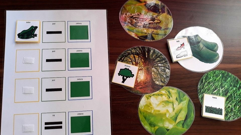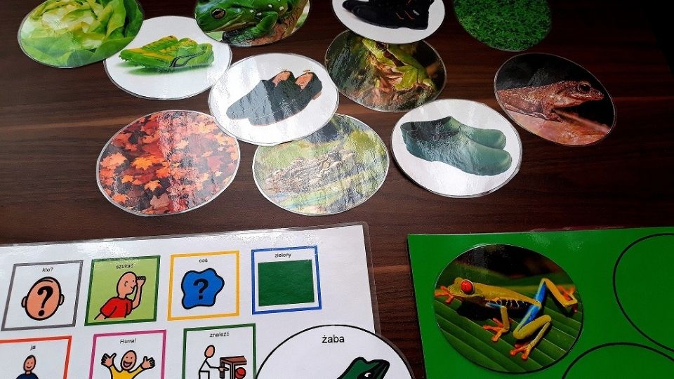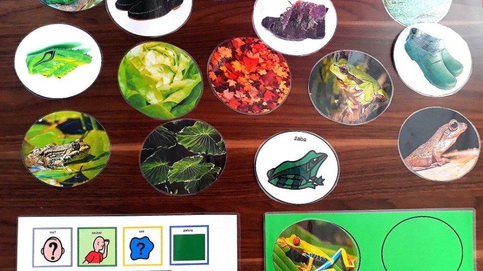 Na stole pojawiają się np. żaby, liście i buty (15 ilustracji). Dziecko kolejno odnajduje wskazywane elementy: zieloną żabę, zielone liście, zielone buty. Na końcu zostają ilustracje odrzucone z powodu koloru.