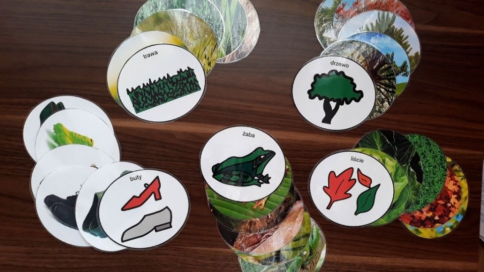 Do gry wykorzystałam pięć kategorii ilustracji: żaba, trawa, liście, drzewo, buty. Każda kategoria zawiera pięć ilustracji (symbole PCS), z których zawsze jedna jest „niepasująca” – w innym kolorze. Gra jest przewidziana dla maksymalnie 4 graczy, a dzieci niewerbalne mogą korzystać z tablic kontekstowych.