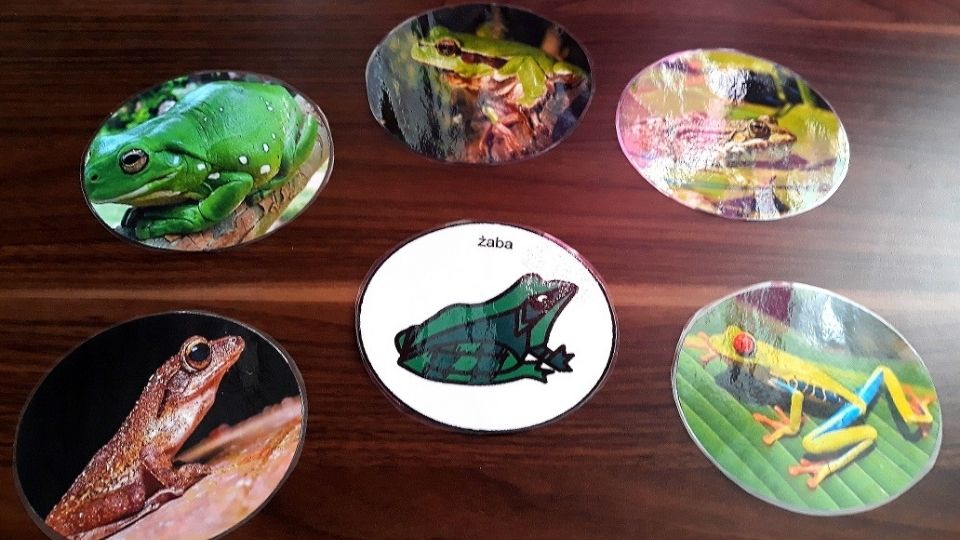 Rozkładamy wszystkie ilustracje np. żab. Dziecko ma za zadanie odnaleźć zieloną żabę i umieścić ją na swojej planszy. Na końcu zostaje element „niepasujący” – i to świetna okazja, by zwrócić uwagę dziecka na różnicę: „Ta żaba nie jest zielona”.