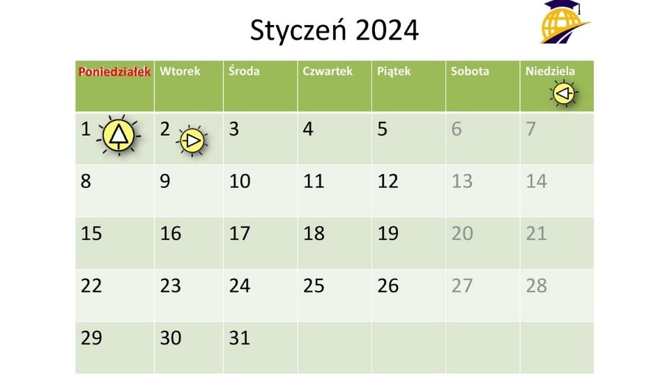 1. Systematyczność – codziennie wracamy do nazw dni, miesięcy czy pór roku. Robimy to w różnych formach: układając elementy na tablicy, korzystając z prezentacji, grając w gry.