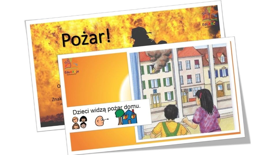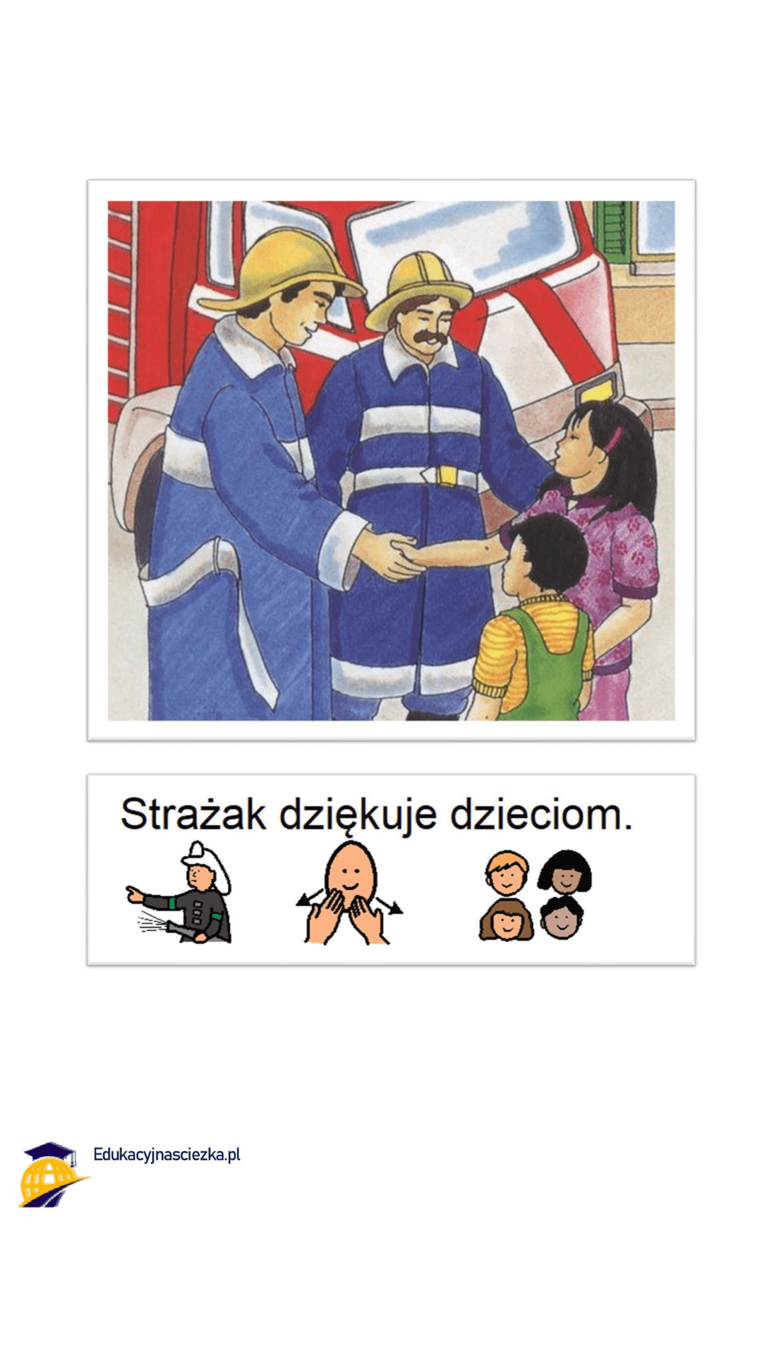 Materiał przybliżający dzieciom rolę strażaków. Zawiera ilustracje i proste opisy, dzięki którym uczniowie poznają działania straży pożarnej i uczą się reagować w sytuacjach zagrożenia pożarem.
