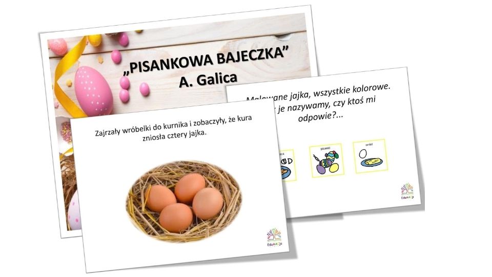 Ilustrowane opowiadanie o historii pisanek (36 slajdów) z pytaniami sprawdzającymi rozumienie. Dostępne w dwóch wersjach: z pytaniami oraz do samodzielnego czytania.