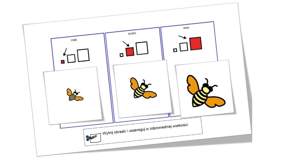 • Karty pracy: stopniowanie wielkości. Materiał pomoże rozwijać umiejętność różnicowania ilustracji pod względem wielkości oraz układanie obrazków w szeregu rosnącym: od największego do najmniejszego.