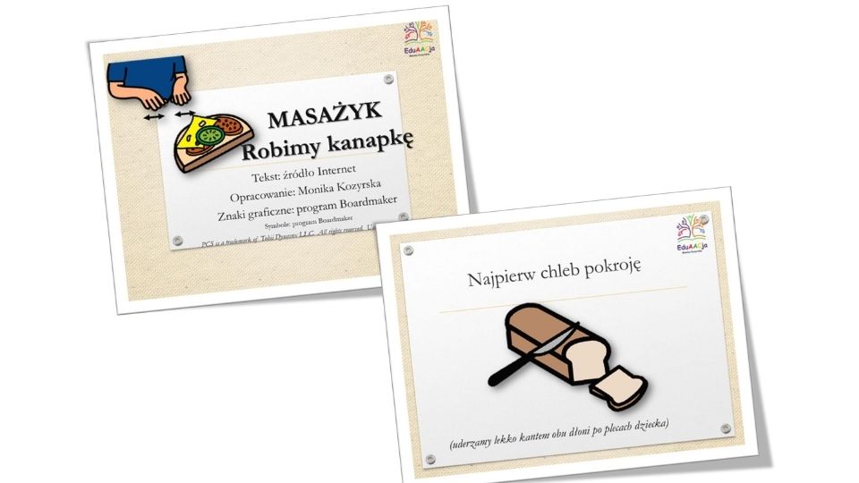 Wierszowana instrukcja ruchowa – dziecko wykonuje masażyk na plecach drugiego dziecka zgodnie z tekstem wiersza. Może być też odczytywana jako instrukcja tworzenia kanapki. Materiał rozwija: koordynację ruchową, świadomość ciała i komunikację niewerbalną.