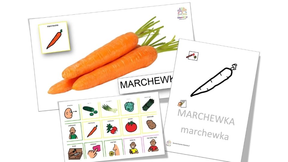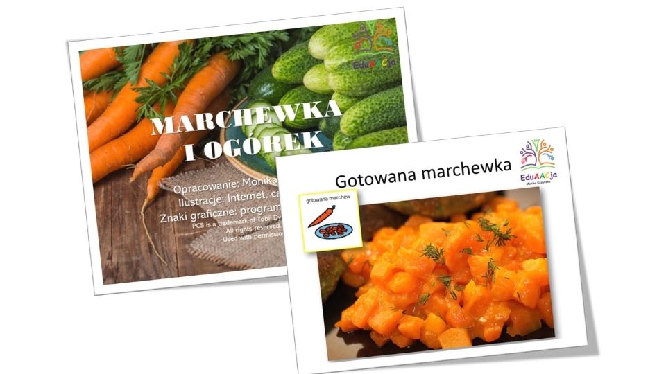 Prezentacja przedstawia dwa wybrane warzywa – marchewkę i ogórek – w różnych formach przetworzonych i naturalnych. Zawiera symbole PCS, etykiety drukowane i realistyczne zdjęcia. Materiał rozwija: klasyfikację, uogólnianie pojęć, rozpoznawanie form i rozwój mowy czynnej.
