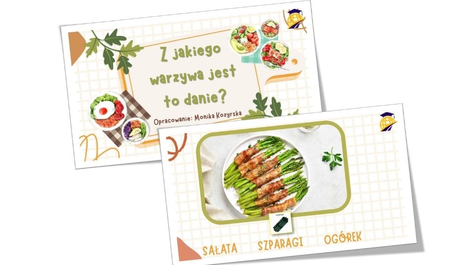 Prezentacja stanowiąca doskonałe ćwiczenia logiczne i językowe – dziecko analizuje ilustrację potrawy i wybiera spośród trzech warzyw to, z którego powstało danie.