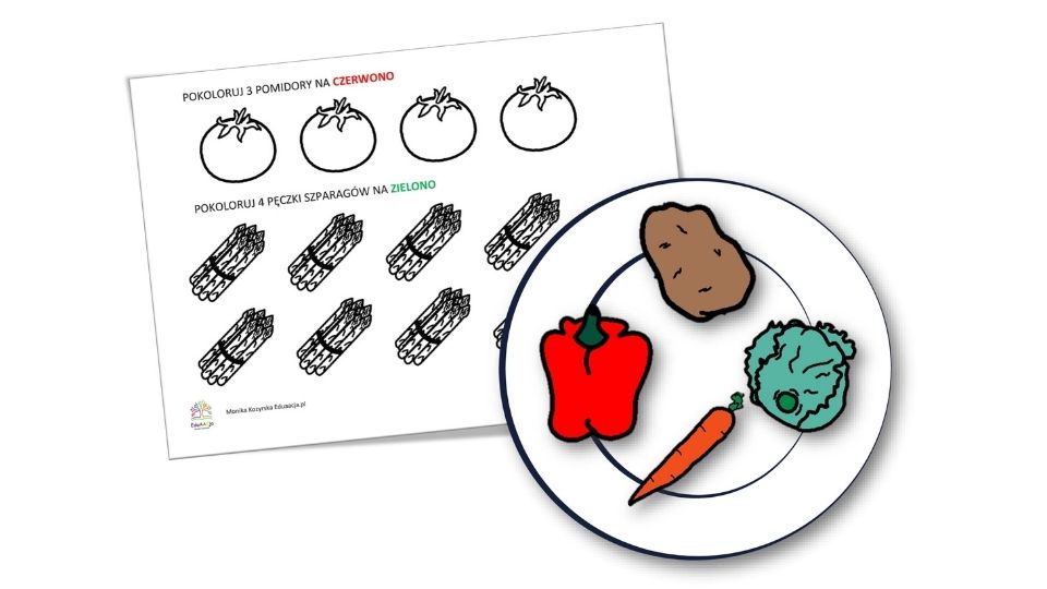 Zadanie na spostrzegawczość – dziecko odnajduje pomidora wśród innych warzyw.