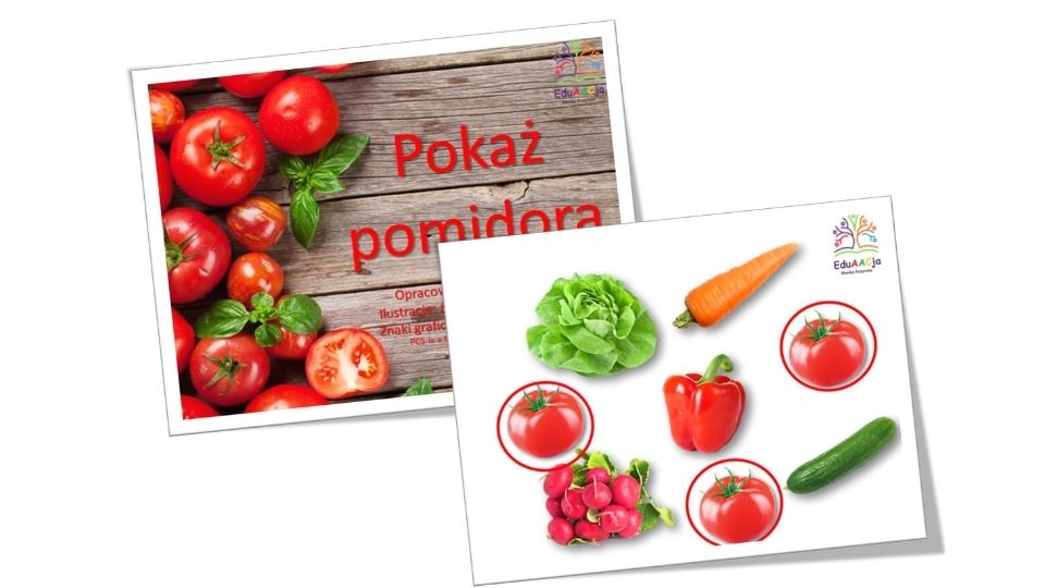 Kolejna prezentacja percepcyjna – dziecko rozpoznaje pomidora w różnych kontekstach i tła. Materiał rozwija: spostrzegawczość, koncentrację, rozumienie pojęć i umiejętność porównywania.
