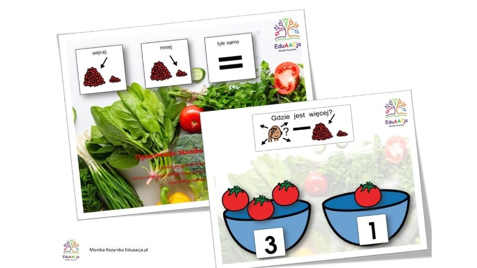 Ćwiczenia matematyczne – dziecko porównuje liczebność dwóch zbiorów i wskazuje gdzie jest więcej, gdzie mniej a może tyle samo. Materiał rozwija: myślenie matematyczne oraz porównywanie zbiorów.