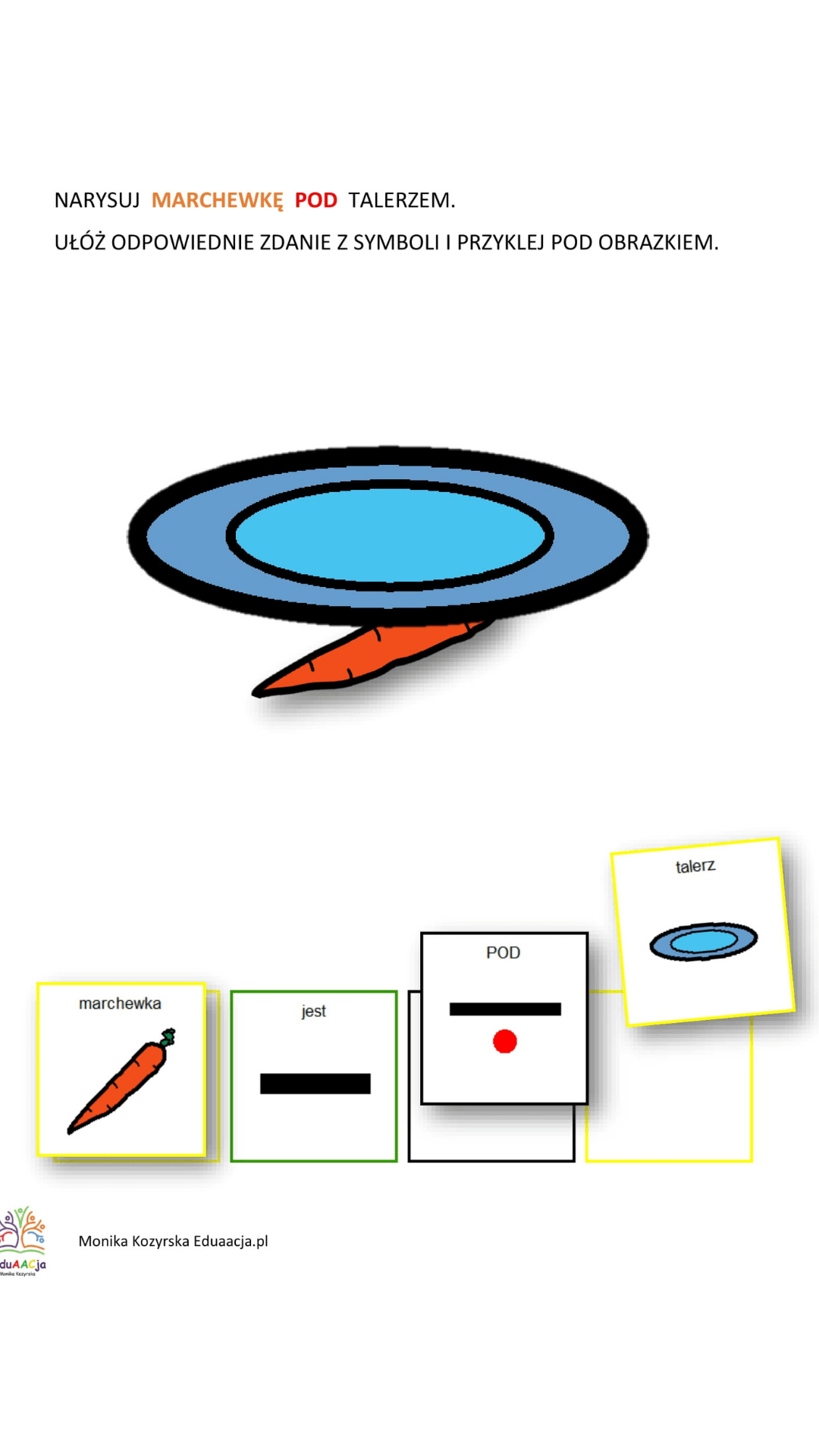 Ćwiczenia orientacji przestrzennej – dziecko układa marchewkę względem talerza zgodnie z poleceniem. Materiał rozwija: rozumienie pojęć przestrzennych (nad, pod, obok, w, za), słuchanie ze zrozumieniem i koordynację wzrokowo-ruchową.