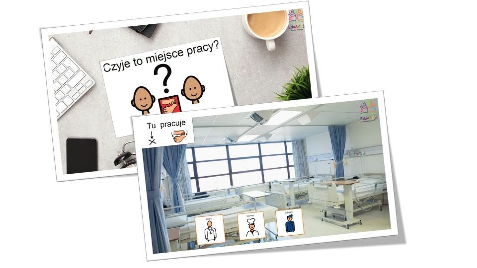 Kiedy już dowiemy się co robią przedstawiciele danych profesji, poznajemy miejsca, w których pracują. W tym celu prezentacja w formie zagadek, dzięki, którym poznawanie będzie bardziej atrakcyjne. Wybrana odpowiedź tworzy zdanie, które wspólnie z dzieckiem odczytujemy. Do zestawu dołączone są również plansze poglądowe, a materiał pdf umożliwia ćwiczenia dopasowania zawodu do miejsca pracy.