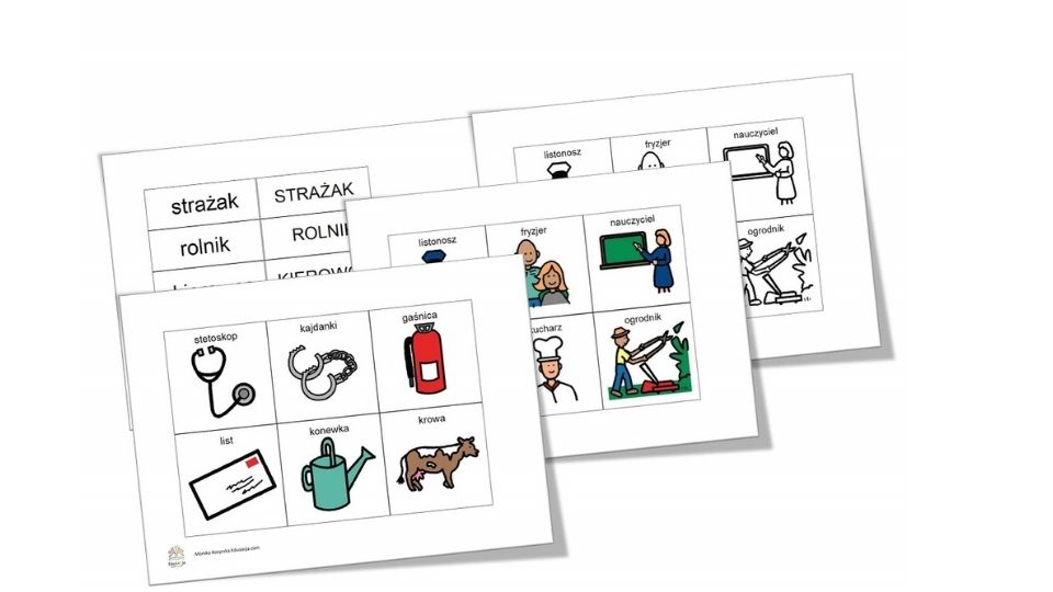 Propozycja gry o zawodach tradycyjnie ma kilka postaci, w zależności od możliwości naszych podopiecznych. Przygotowane karty pracy mogą służyć jako memory, możemy poszukiwać atrybutu danego zawodu, jak również rozpoznawać etykiety wybranych profesji.