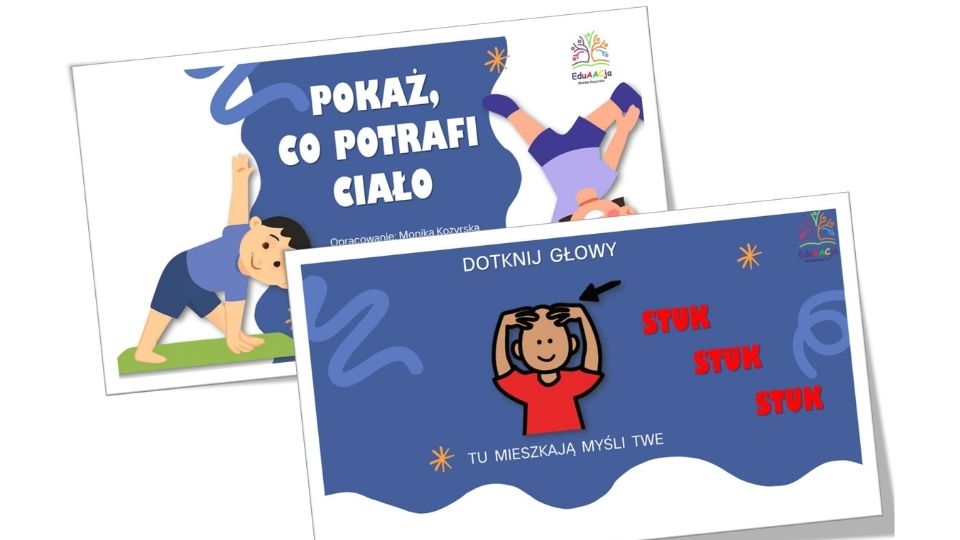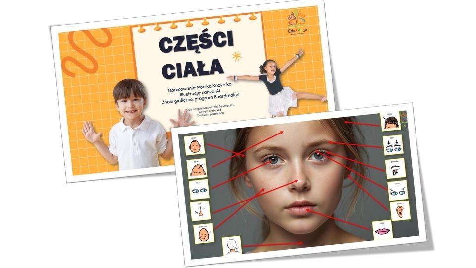Interaktywna prezentacja uczy określania i nazywania części ciała, przedstawionych na schemacie chłopca i dziewczynki. Dziecko wskazuje części ciała, odczytuje etykiety PCS i buduje proste zdania („To jest ręka”, „To są oczy”).