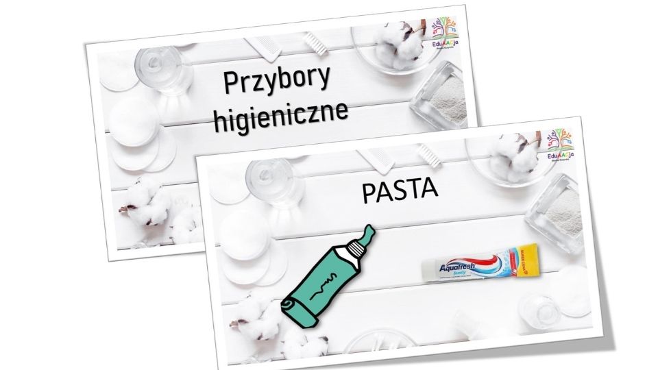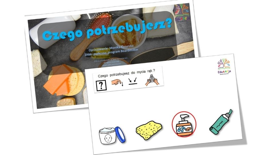 Przedstawienie podstawowych przyborów (mydło, szampon, ręcznik, pasta, szczoteczka, grzebień, chusteczka, papier toaletowy) wraz z symbolami PCS.