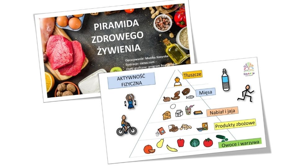 Rozbudowana prezentacja krok po kroku omawia wszystkie poziomy piramidy: aktywność fizyczną, warzywa i owoce, produkty zbożowe, nabiał, białko, zdrowe tłuszcze i wodę. Realistyczne zdjęcia uzupełniono etykietami i symbolami PCS.