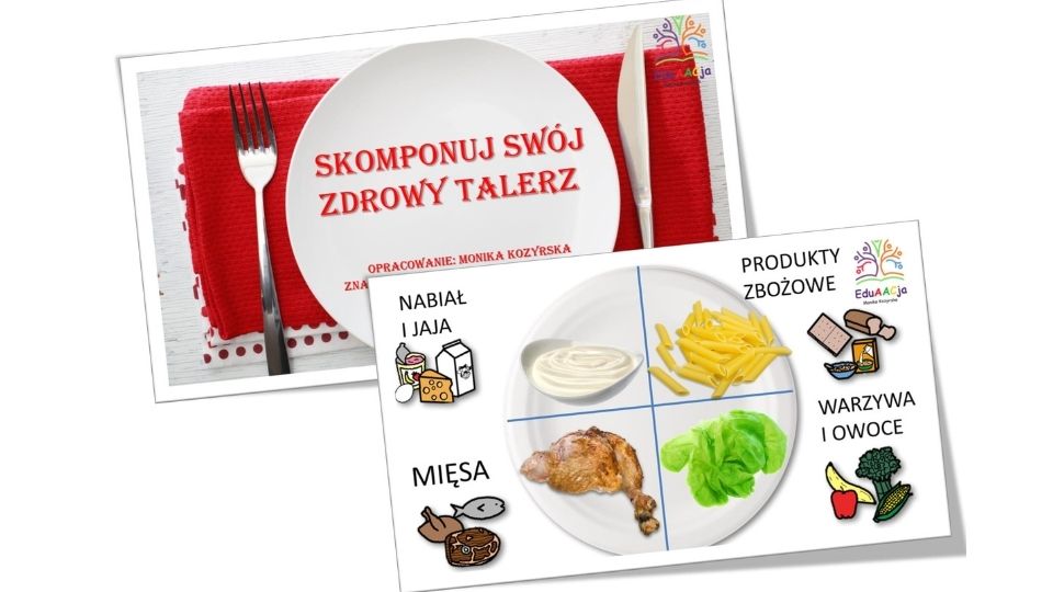 Interaktywna prezentacja czterech kategorii żywności. Dziecko wybiera brakujące produkty i układa własny talerz zgodnie z zasadami zdrowego jedzenia.