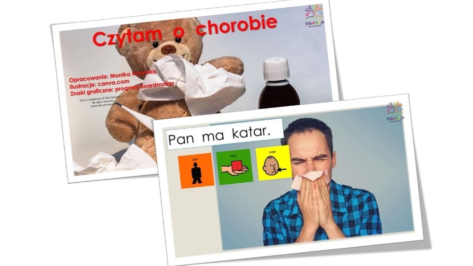 Ćwiczenia w rozpoznawaniu objawów choroby na zdjęciach oraz utrwalanie określeń: pan/pani, chłopiec/dziewczynka. Dziecko wskazuje, kto jest chory, i opisuje obrazek.
