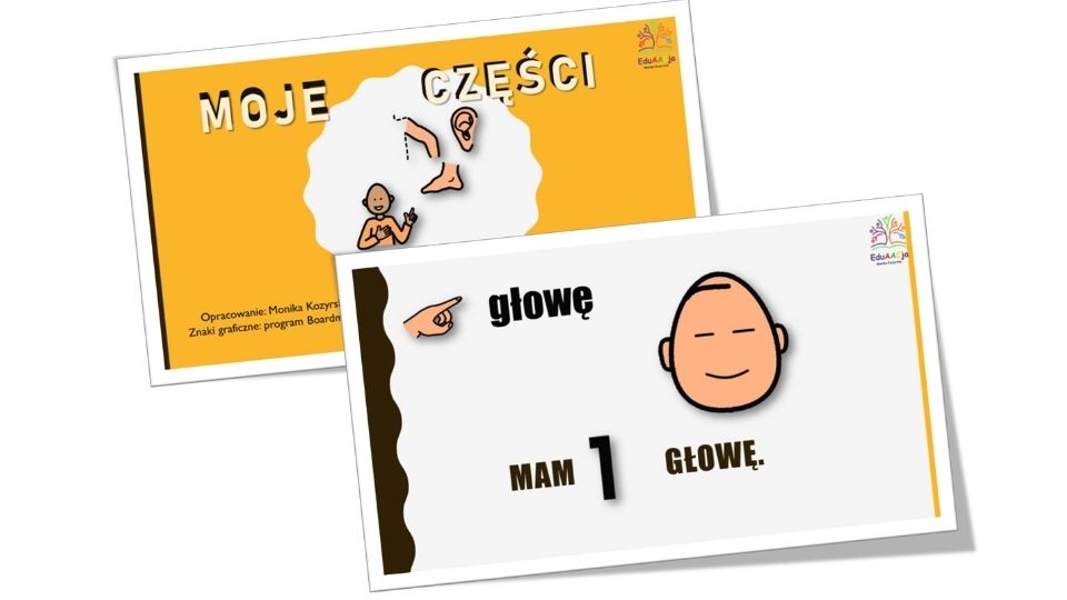 Prezentacja uczy wskazywania części ciała na sobie, na ilustracji oraz określania ich liczebności (np. „mam dwie ręce”, „mam jedno ucho”).