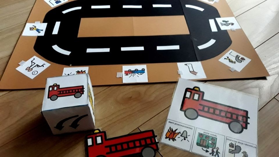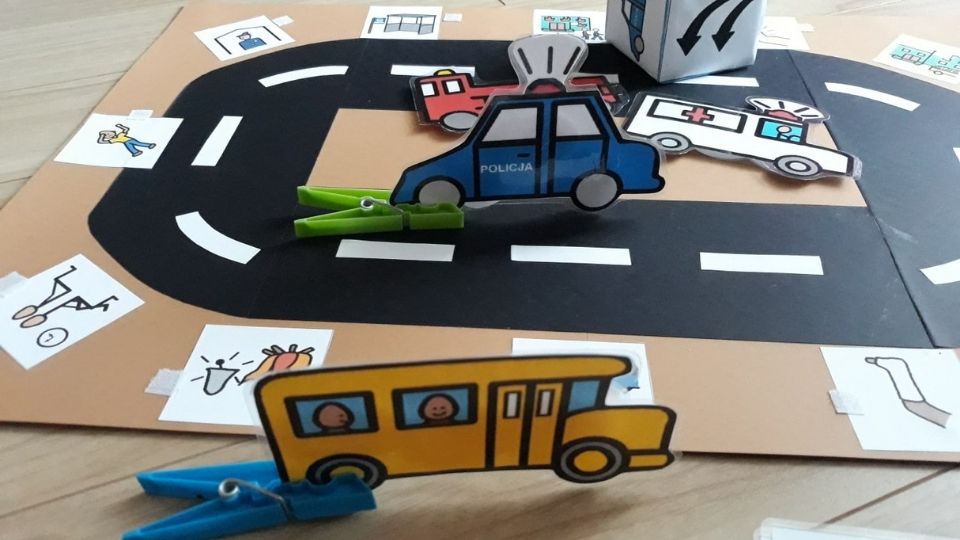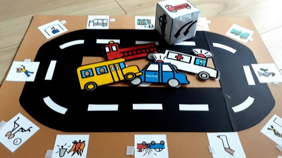 • Kiedy mamy już wszystkie elementy, tzn. plansza z ulicą, pojazdy (ze spinaczem lub bez), tablice ratunkowe pojazdów oraz kostkę możemy zaczynać grę! 🙂