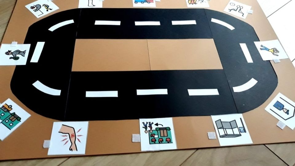 1. Plansza – na brystolu rysujemy drogę, oznaczamy pasy ruchu, a przy drodze umieszczamy symbole PCS przedstawiające różne sytuacje.