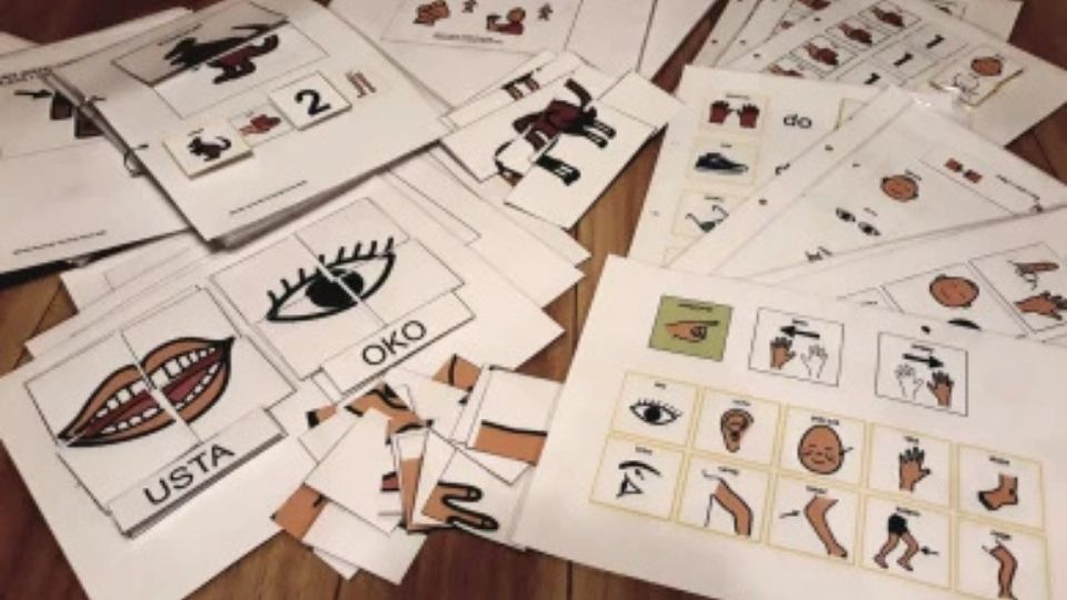 Pomocne mogą być tablice z symbolami – najpierw wskazujemy część ciała na obrazku, a następnie pokazujemy ją na sobie. To świetny trening analizy wzrokowo-ruchowej, koncentracji uwagi i rozumienia poleceń.