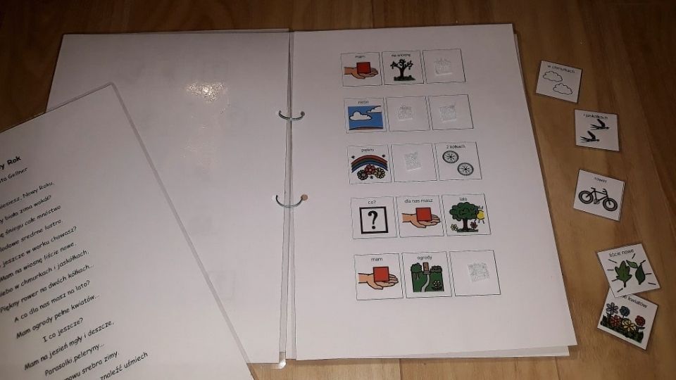 W materiałach wykorzystałam symbole PCS z programu Boardmaker, które świetnie sprawdzają się jako wsparcie w komunikacji i rozumieniu tekstu. Dzięki nim wiersz staje się nie tylko treścią do odczytania, ale również interaktywnym doświadczeniem, w którym dziecko działa, reaguje i uzupełnia ilustracje.